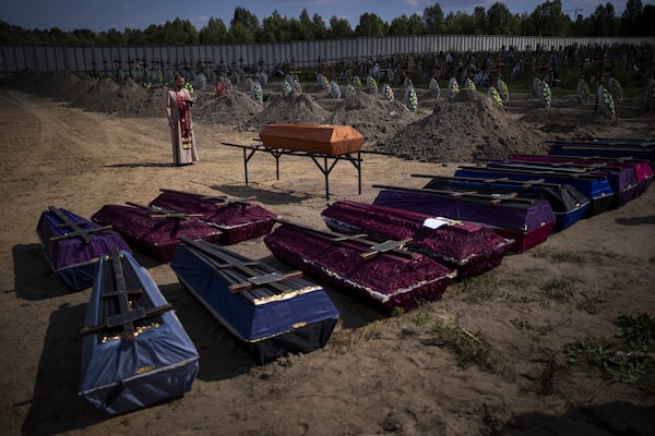 A priest blesses coffins with unidentified civilian bodies, who died on the territory of the Bucha community during the Russian occupation period in February-March 2022, during a funeral in Bucha, near Kyiv, Ukraine, on Friday, Sept. 2, 2022.Emilio Morenatti/The Associated Press