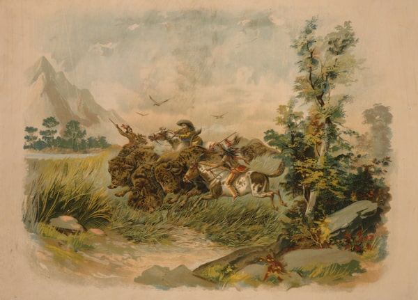 By the time this coloured lithograph of a buffalo hunt was made in 1897, settlers had already badly depleted stocks of game animals in the American West, hampering Indigenous people's ability to feed themselves.Muller, Luchsinger & Co., Library of Congress.