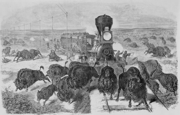 Mass slaughters, like this one on the Kansas Pacific Railroad, were a common practice by railways that saw roaming animals as a nuisance that could block their routes.Wood engraving by W. Meason after Ernest Griset, Library of Congress