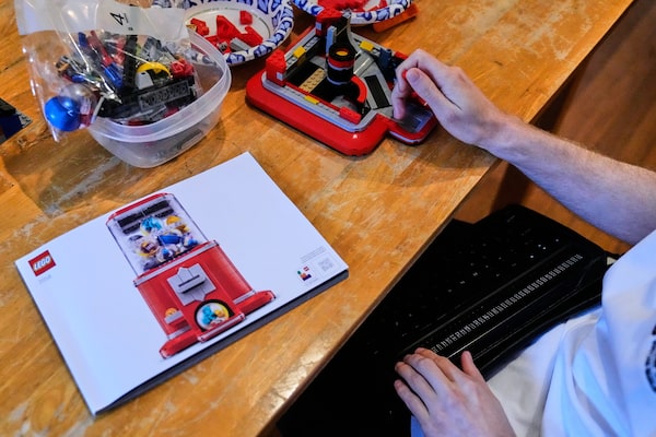 Matthew Shifrin, the founder of Bricks for the Blind, feels for specific pieces while building a Lego gum ball machine at his family's home in Newton, Mass., on March 20.Charles Krupa/The Associated Press