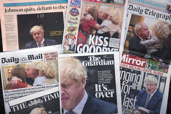 British newspaper front pages on July 8 feature news about Prime Minister Boris Johnson's resignation speech the day before.Dan Kitwood/Getty Images