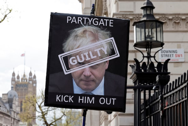 A protester holds a placard with photographs of Mr. Johnson, bottom right, his cabinet members and Russian President Vladimir Putin, top left, outside Parliament on July 6.Matt Dunham/The Associated Press