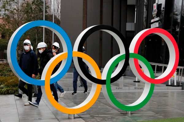 In this March 4, 2020, file photo, people wearing masks walk past the Olympic rings near the New National Stadium in Tokyo.The Associated Press