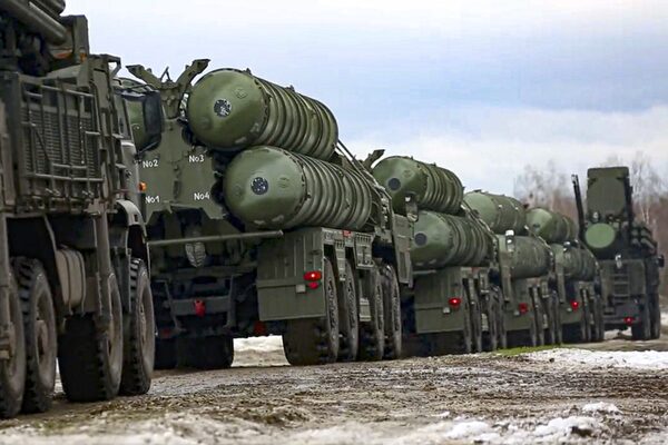 In this photo taken from video provided by the Russian Defense Ministry Press Service on Feb. 10, combat crews of the S-400 air defense system drive to take up combat duty at the training ground in the Brest region in Belarus.The Associated Press