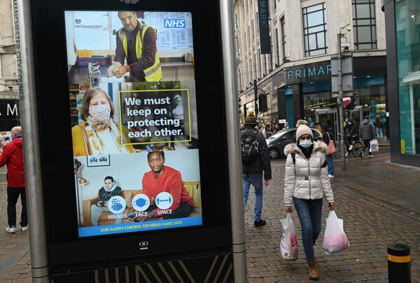 A pedestrian wearing a mask walks past an electronic sign in central Manchester, England, on Nov. 4, 2020.OLI SCARFF/AFP/Getty Images