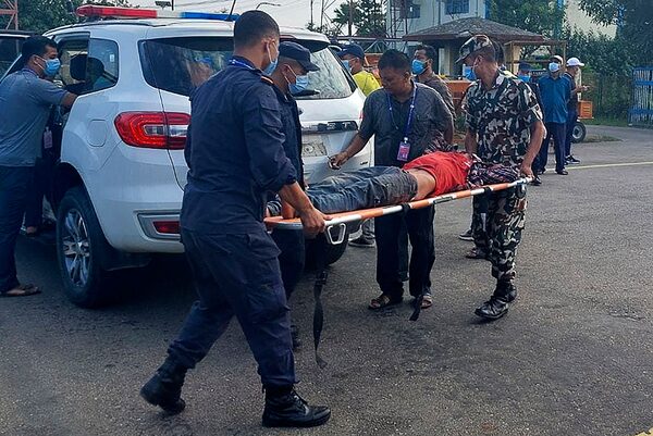 Police and army personnel carry an injured passenger to a hospital in Nepalgunj on Oct. 12, 2021.KRISHNA ADHIKARI/AFP/Getty Images