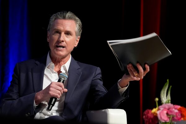 California Gov. Gavin Newsom holds a fireside chat with Stephen Cheung on Feb. 26, 2025, at the East LA College in Los Angeles.Damian Dovarganes/The Associated Press