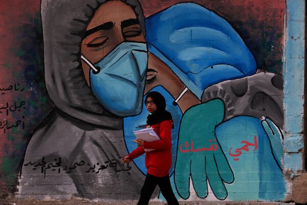 A mural encouraging face masks, including an Arabic-language message reading 'protect yourself,' is shown on the main road of Nusseirat refugee camp in the central Gaza Strip.Adel Hana/The Associated Press