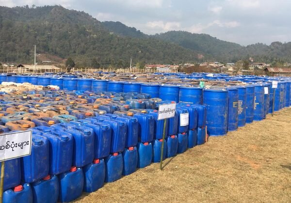 Precursor chemicals used to make illicit drugs such as methamphetamine, ketamine, heroin and fentanyl seized by Myanmar police and military are seen in this undated photo near Loikan village in Shan State, between February and April, 2020.Myanmar Police/UNODC/Reuters