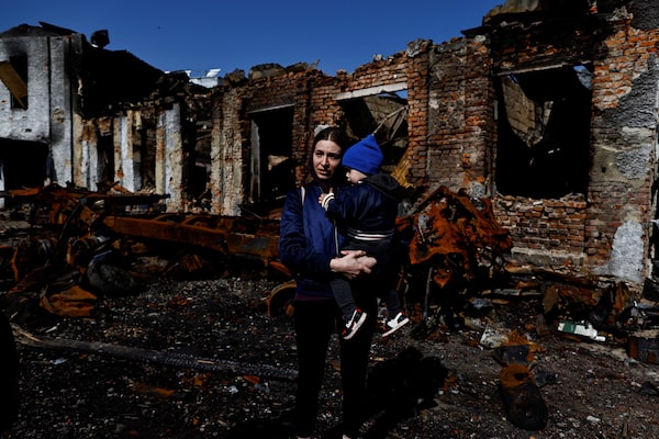 Inna, 28, and her son Sviatoslav, 2, stand beside a destroyed Russian army vehicle, amid Russia's invasion of Ukraine, in Trostianets, Sumy region, Ukraine, on April 15.ZOHRA BENSEMRA/Reuters