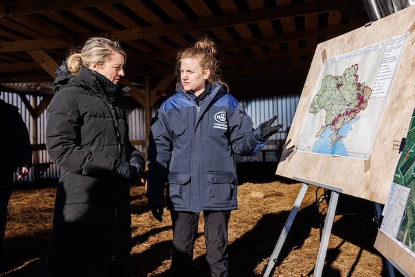 Foreign Minister Mélanie Joly speaks to a deminer at the HALO Trust training facility during the practice session in Ukraine on Feb. 15.Anton Skyba/The Globe and Mail