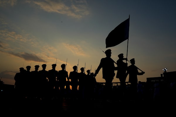 Members of the Qatar Armed Forces Band Regiment march in formation while performing at Katara Beach in Doha, Qatar, on Dec. 7.Julio Cortez/The Associated Press