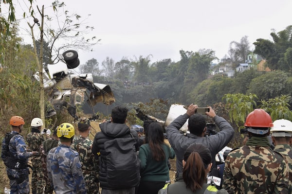 People watch as wreckage from a plane crash is lifted from a gorge in Pokhara, Nepal, on Jan. 16,.Krishna Mani Baral/The Associated Press