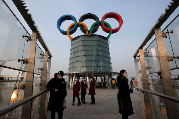 People walk near the Olympic Tower during an organized media tour in Beijing, on Jan. 22, 2021.TINGSHU WANG/Reuters