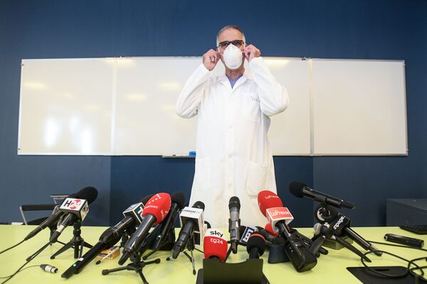 Italian professor Alberto Zangrillo, San Raffaele Hospitals personal doctor of former Italian prime minister Silvio Berlusconi, adjusts his face mask during a press conference after Berlusconi was hospitalised after testing positive for COVID-19, at the San Raffaele Hospital in Milan, on September 4, 2020.PIERO CRUCIATTI/AFP/Getty Images