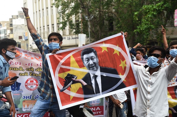 Activists shout slogans during an anti-China demonstration in Ahmedabad, India, on June 24, 2020.SAM PANTHAKY/AFP/Getty Images