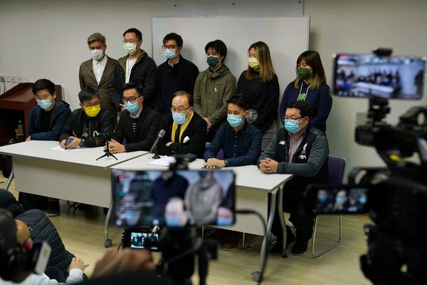 Party members of the pro-democracy camp attend a news conference on Wednesday, Jan. 6, after more than 50 Hong Kong activists were arrested under the national security law.LAM YIK/Reuters