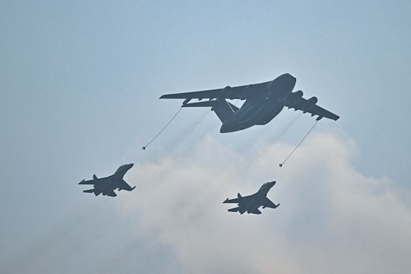 A Xi'an Y-20 Kunpeng aircraft and two jet fighters perform an air refueling maneuver.PEDRO PARDO/AFP/Getty Images