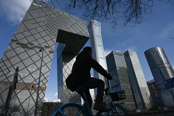 A man rides a bicycle on a street at the central business district in Beijing, on March 17.JADE GAO/AFP/Getty Images