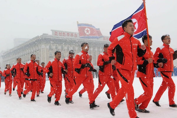 North Korean officials run in Pyongyang's Kim Il Sung Square on Jan. 14, the first national sports day of the new year.Cha Song-ho/The Associated Press