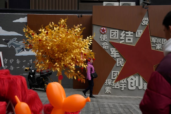 Propaganda at a Beijing mall on Jan. 17 calls for patriotism and unity between society and the military.Ng Han Guan/The Associated Press
