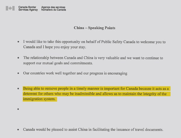 To address the backlog of people waiting for removal, Canadian officials sought a “Readmission Arrangement” with China that would establish standards and protocols to speed the process. A draft of the arrangement stipulates information-sharing arrangements and set timelines for China to respond to removal requests.