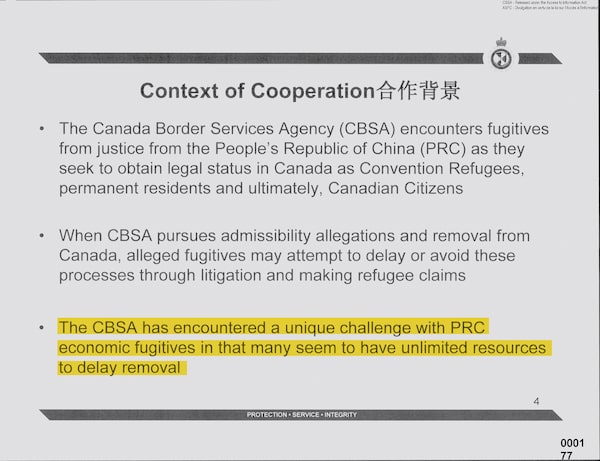 The CBSA was also frustrated that many Chinese economic fugitives “seem to have unlimited resources to delay removal,” one document says.