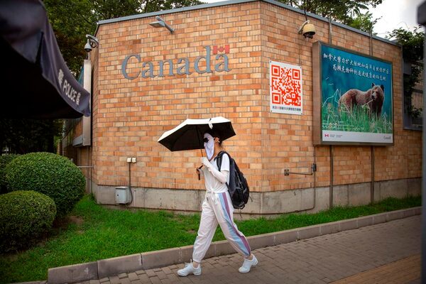 A woman wearing a face mask to help protect against the coronavirus walks past the Canadian Embassy in Beijing on Aug. 6, 2020.The Associated Press