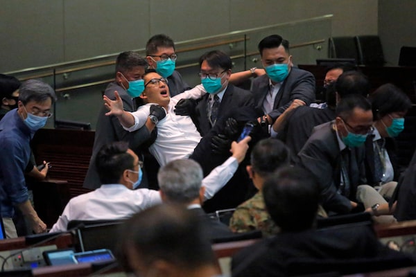 Pan-democratic legislator Lam Cheuk-ting, is taken away by security during a Legislative Council's House Committee meeting in Hong Kong, Monday, May 18, 2020.Kin Cheung/The Associated Press