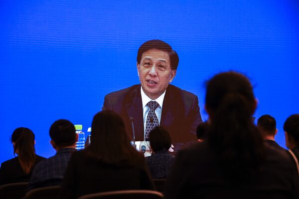 Zhang Yesui, the spokesperson for the third session of the 13th National People's Congress, speaks during a video online press conference in Beijing on May 21, 2020, a day before the opening ceremony of the NPC.LEO RAMIREZ/AFP/Getty Images