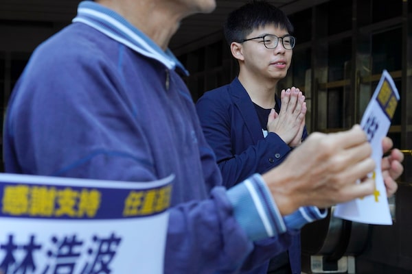 Pro-democracy activist Joshua Wong, right, gestures, as election winner candidate Kelvin Lam greets people to thank for their support, outside South Horizons Station in Hong Kong, Monday, Nov. 25, 2019.Vincent Yu/The Associated Press