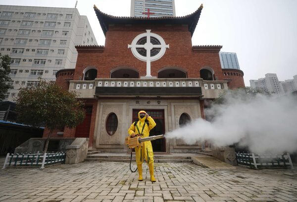 A worker disinfects the Hankou Salvation Church in Wuhan on March 6, 2020.STR/AFP/Getty Images