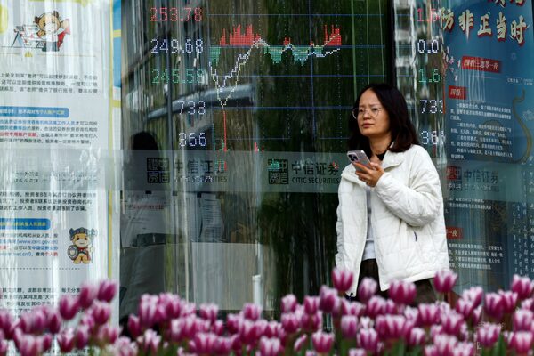 A woman walks past a brokerage house with a display board showing the stock index information, in Beijing, China April 9, 2025.Tingshu Wang/Reuters