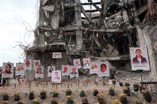 Portraits of victims reportedly killed in a U.S.-Israeli air strike on a residential building near are displayed in Tehran on Monday.-/AFP/Getty Images