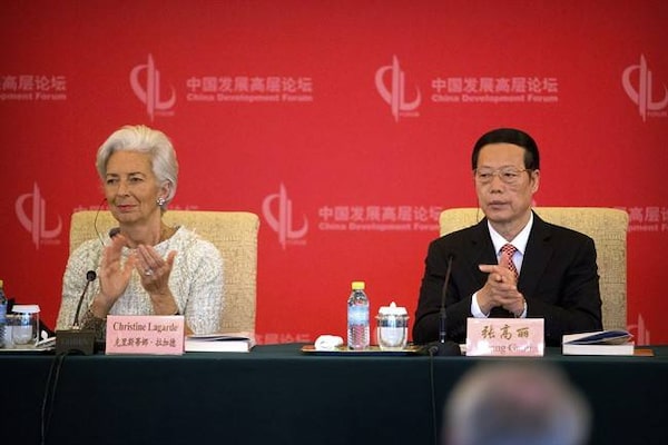 IMF Managing Director Christine Lagarde, left, and Chinese Vice Premier Zhang Gaoli applaud during the opening ceremony of the China Development Forum, at the Diaoyutai State Guesthouse, in Beijing, on March 20, 2016.The Associated Press