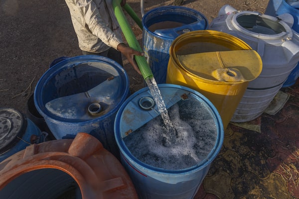 A farmer fills water, supplied by a government tanker, into barrels outside Beed, India on May 4.Rafiq Maqbool/The Associated Press