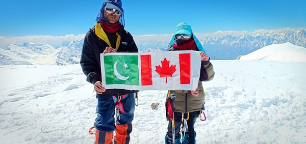Selena Khawaja and her father, Yousaf, hold Pakistani and Canadian flags on Spantik Peak in 2019.Yousaf Khawaja