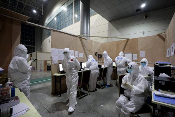 In this Friday, Feb. 21, 2020, photo, medical workers in protective suits gather at a temporary hospital at Tazihu Gymnasium in Wuhan in central China's Hubei province.The Associated Press