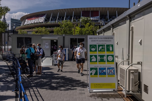 A COVID-19 warning sign at an entrance to the Tokyo Olympic stadium, on July 21.Carl Court/Getty Images