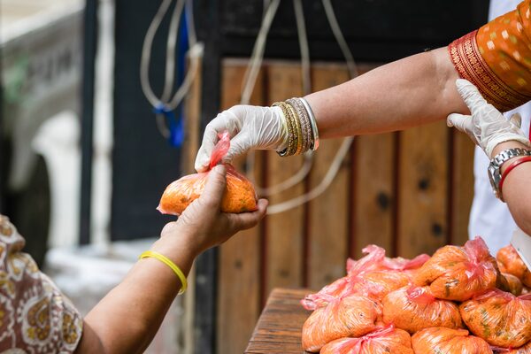 A woman receives a free meal distributed by the community service center on Apr. 6, 2021.SOPA Images/Getty Images