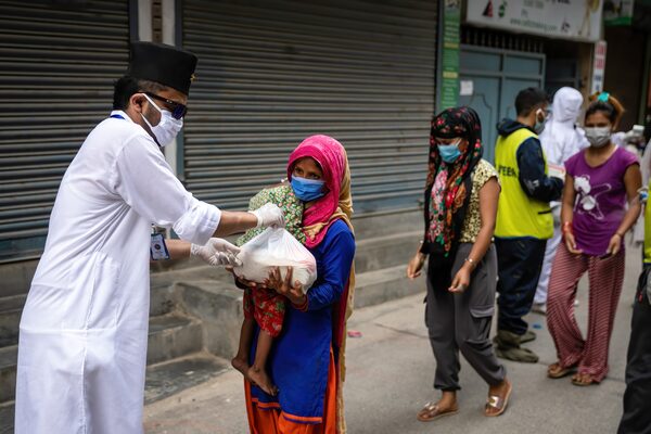People receive food packages delivered by Turkey' Diyanet Foundation during the holy month of Ramadan in Nepal's Kathmandu on April 21, 2021.Anadolu Agency/Getty Images