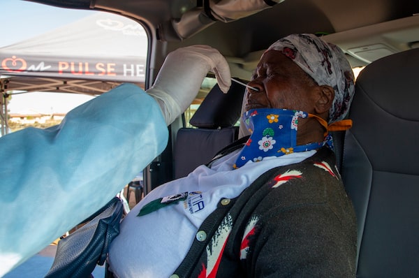 An elderly woman reacts as a heath worker collects a sample to test for COVID-19 in Katlehong, Johannesburg. South Africa's reported coronavirus cases are surging.Themba Hadebe/The Associated Press