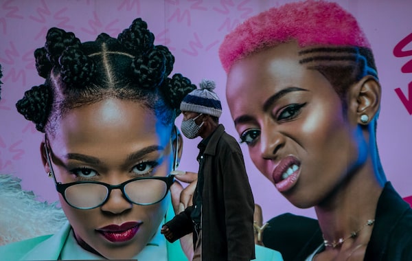 A man wearing a face mask to protect against coronavirus, walks past a hair product billboard on the street in Soweto, South Africa, Monday, June 29.Themba Hadebe/The Associated Press