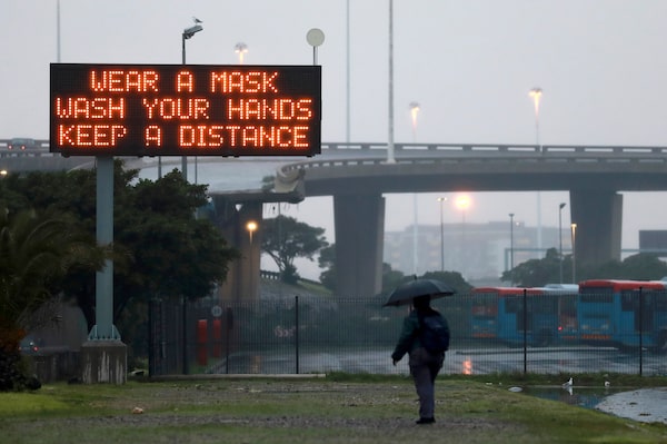 A man walks beneath a COVID-19 sign advising precautions people should take to prevent the spread of coronavirus in Cape Town, South Africa, Monday, June 29. South Africa's hospitals are setting up temporary wards and hoping advances in treatment will help the countrys health facilities from becoming overwhelmed.Nardus Engelbrecht/The Associated Press