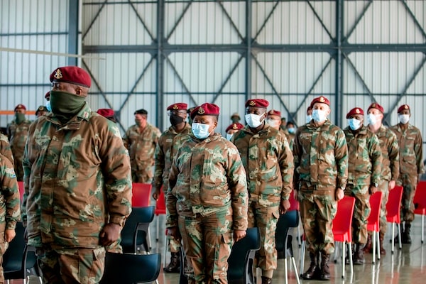 South African National Defence Force military health practitioners stand on guard at Air Force Station Port Elizabeth on July 5, 2020.MICHAEL SHEEHAN/AFP/Getty Images