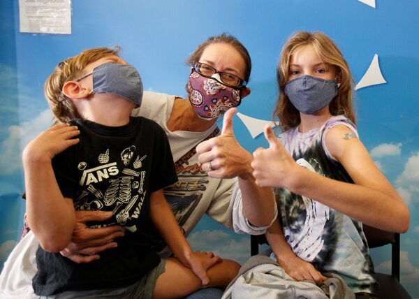 Monica Strickland with her daughter Madeleine, 11, and son Liam, 6, after her kids received the Pfizer-BioNTech vaccine at Rady's Children's Hospital in San Diego, Calif., on Nov. 3.MIKE BLAKE/Reuters