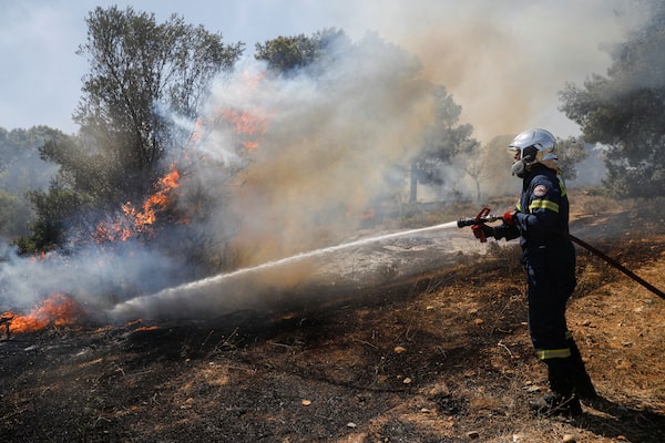 A firefighter works to extinguish a wildfire burning in Pallini, near Athens, Greece, on July 20.COSTAS BALTAS/Reuters
