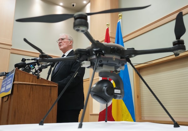 Bill Blair, Minister of National Defence, makes an announcement regarding additional SkyRanger R70 drone support to Ukraine, in Toronto, on Feb. 19.Nathan Denette/The Canadian Press