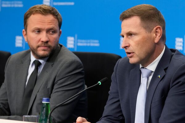 Estonia's Foreign Minister Margus Tsahkna, left, and Defence Minister Hanno Pevkur attend a news conference in Tallinn, Estonia, on Oct. 10.Sergei Grits/The Associated Press