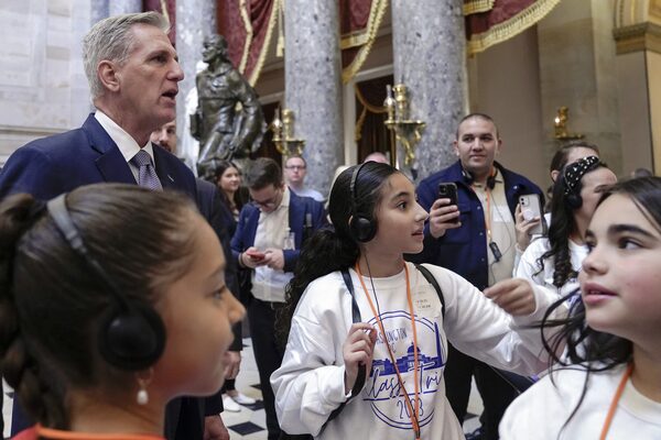 Former U.S. Speaker of the House Representative Kevin McCarthy talks with visitors after leaving the House chamber on Capitol Hill in Washington on Oct. 20.Mariam Zuhaib/The Associated Press